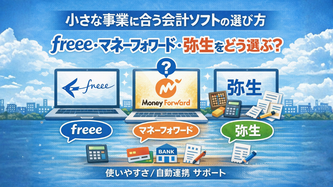 freee、マネーフォワード、弥生など、何を基準に選べばいいのか。小さな事業に合う会計ソフトの選び方をまとめています。