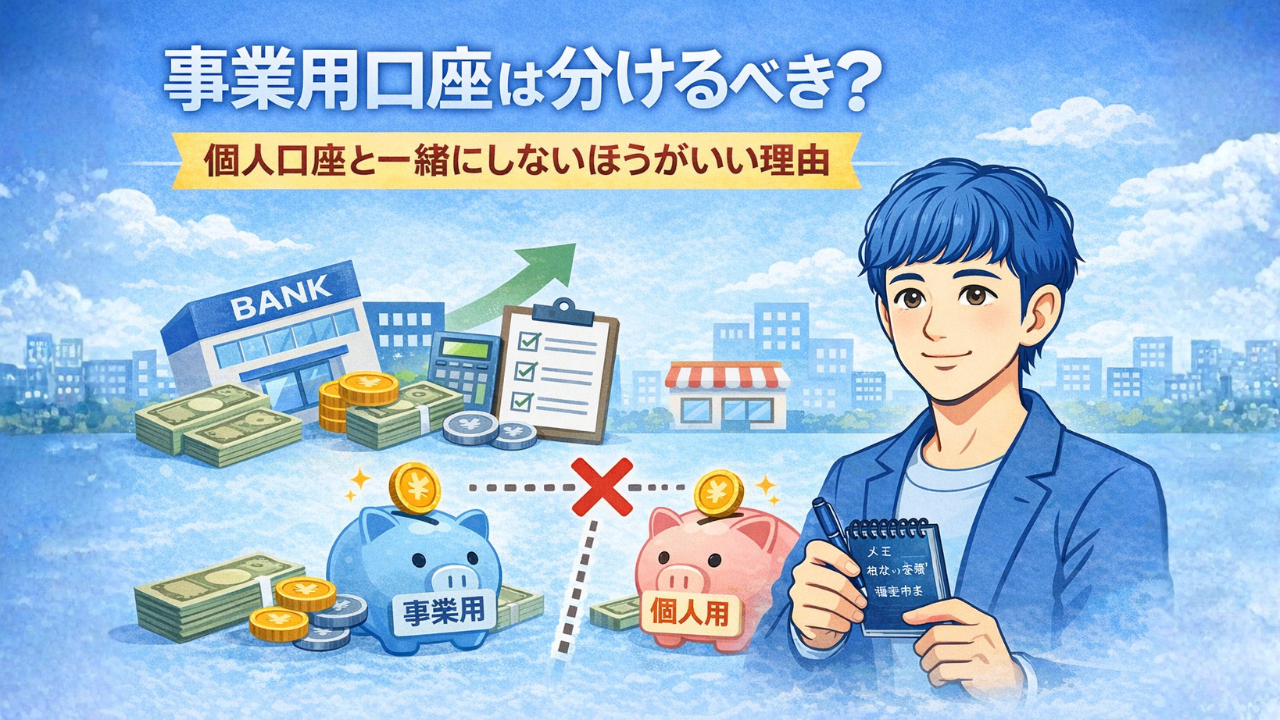 個人事業主として仕事を始めると、かなり早い段階で迷いやすいのが「銀行口座って事業用で分けたほうがいいの?」ということではないでしょうか。 まだ売上が小さいうちは、今使っている個人口座のままでもいいように見えるかもしれません。でも実際には、早めに分けておいたほうがかなり楽です。 個人で事業を行う人には、記帳と帳簿書類の保存が必要です。この前提を考えると、家計と事業のお金が混ざっている状態は、あとでかなり整理しにくいです。 この記事では、 事業用口座を分けたほうがいい理由 個人口座のままだと何が大変か どんな ...